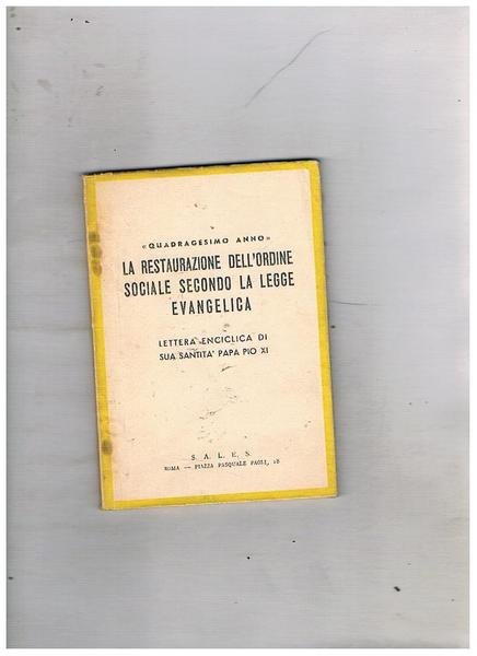 La restaurazione dell'ordine sociale secondo la legge evangelica. Lettera enciclica di Sua Santità Papa Pio XI. | Libri antichi e moderni | Pio Xi.