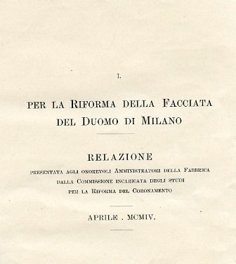 In-4°, pp. 40, brossura editoriale protetta da velina. Svariate piante, xilografie e fototipie f.t. e intercalate n.t. Ottimo esemplare. Contiene: 1. Relazione della commissione incaricata degli studi per la riforma del coronamento: aprile 1904. 2. Verbale della seduta 4 maggio della fabbrica del Duomo: relazione degli amministratori e conclusioni. 3. Verbale 9 maggio della seduta definitiva della amministrazione della fabbrica e della commissione.