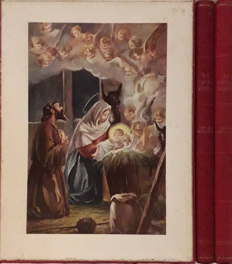 Opera completa in 2 volumi rilegati in tutta tela con titoli in oro al piatto anteriore e al dorso, entrambi contenuti in un unico cofanetto cartonato, illustrato a colori ai piatti e lievemente imbrunito, ottimo stato delle pagine, libri completamente fruibili, prefazione del Card. Celso Costantini, con testi del Sac. Franco Perlatti ed illustrazioni a colori di Alberto Salomone, numero complessivo pagine 406 [volume I] Anno 1953, "Vecchio Testamento", numero pagine 203 [volume II] Anno 1955, "Nuovo Testamento", numero pagine 203