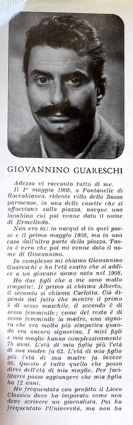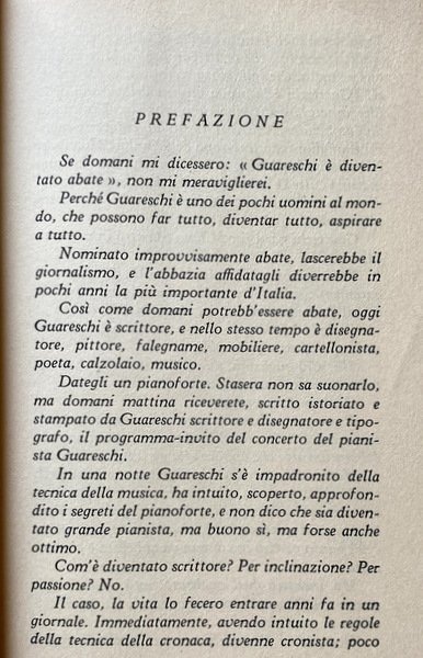 Guareschi partì per Milano ed entrò in una casa editrice. Essendo entrato in una casa editrice, divenne scrittore ed ecco questo libro. Ma, dirà qualcuno, sarà il libro di uno che si intende di tutto ma in niente eccelle. Quel qualcuno sbaglia. Il presente volume è opera di uno scrittore vero che conosce la tecnica della lingua, dell'umorismo, del sentimento; che applica alla perfezione l'arte degli effetti e dei contrasti; che è padrone perfino delle regole della fantasia (la quale, sino a oggi, non aveva regole), e le applica matematicamente, abbellendo e trasformando la realtà proprio nel momento e nel punto preciso in cui essa va abbellita e trasformata. Giovanni Mosca