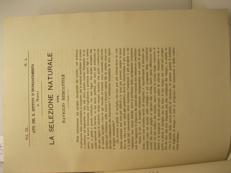 In 4, pp. 7 + (1b). Br. rifatta con carta d'epoca. Stralcio dagli Atti del Real Istituto d'incoraggiamento alle scienze naturali di Napoli, tomo IX, quarta serie. Interessante memoria sull'ampliamento e l'ammodernamento delle navi mercantili delle principali economie marittime. L'A. paragona la fine di un certo tipo di navi, non piu' perfette e antiquate, ad una sorta di lenta decadenza che portera' la loro sostituzione con 'nuove e fiorenti regine' che assomiglia alla selezione naturale darwiniana.