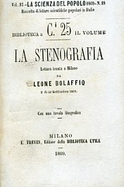 In-24°, pp. 40, brossura originale.Antiporta litografica con alfabeto stenografico. Perfetta copia intonsa. La Scienza del Popolo. Raccolta di letture scientifiche popolari in Italia, vol. 83, n. 38.