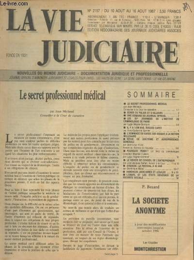 La vie judiciaire n°2157 Du 10 août au 16 août 1987 - Le secret professionnel médical - Echos du palais et d'ailleurs - Une semaine du journal officiel - Les XVe journées de l'institut de criminologie de Paris - Il y a 1000 ans, Hugues Capet - L'hommage