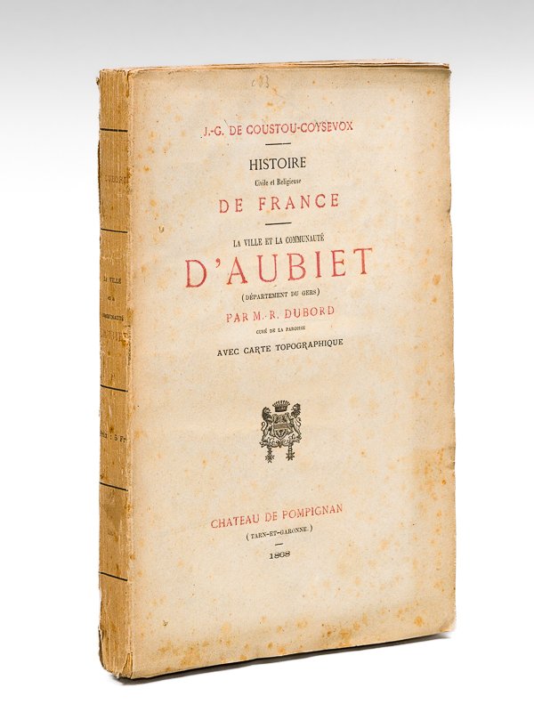 1 vol. in-8 br., Château de Pompignan, Tarn-et-Garonne, 1868, 340 pp. avec une grande carte dépliante dressée par MM. Laffont & Comin Rare exemplaire de cette importante monographie, ouvrage de référence sur la commune d'Aubiet, à l'est d'Auch. Etat très satisfaisant (couv. lég. frottée avec petite fente et petit mq. en couv., bon exemplaire par ailleurs)