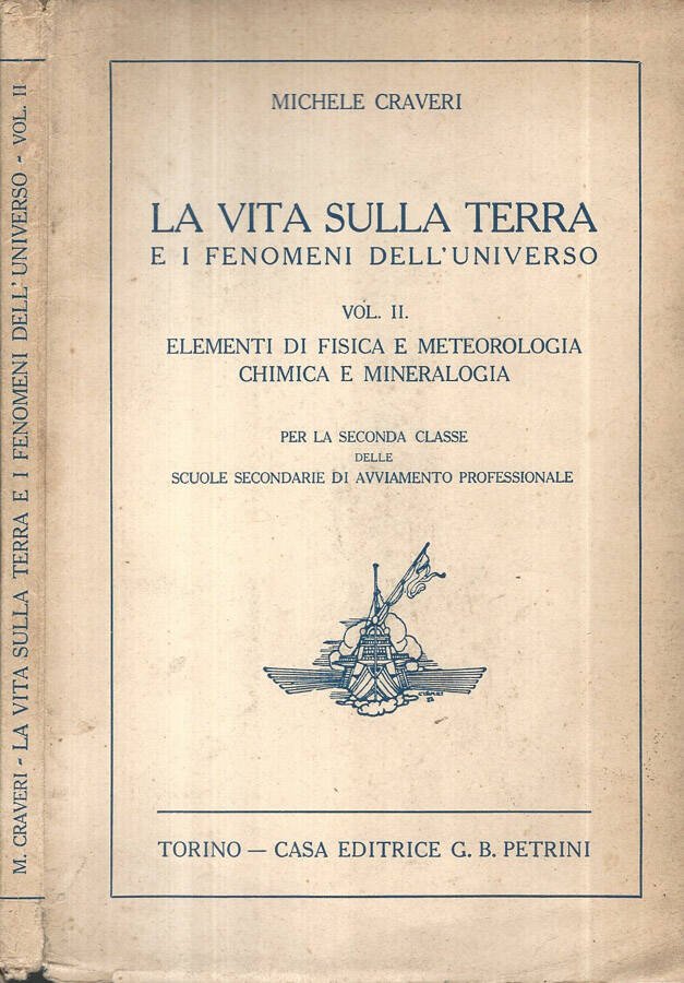 La vita sulla terra e i fenomeni dell'Universo Vol II, per la seconda classe delle scuole di avviamento professionale. Edizione del 1935 in buonissima conservazione, la copertina in carta opaca chiara, il dorso appena arricciato ai bordi. Le pagine all'interno ben conservate, irregolare il taglio. All'interno illustrazioni in nero. La legatura ben resistente. Numero pagine 183.