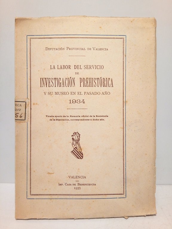 Labor del Servicio de Investigación Prehistórica y su Museo en el pasado año 1934 (Tirada aparte de la Memoria oficial de la Secretaría de la Diputación, correspondiente a dicho año) | Libri antichi e moderni | Diputacion Provincual De Valencia