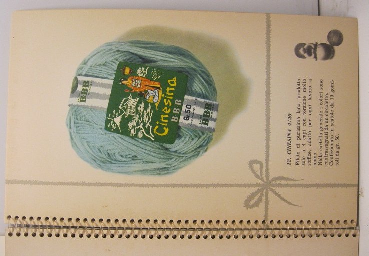 In 8, pp. (40) con 20 schede interne ciascuna raffigurante un gomitolo di lana prodotto da questo lanificio di Monza con la spiegazioni delle caratteristiche tecniche. Cartonatura editoriale con spirale al dorso. Bella grafica anni Cinquanta.
