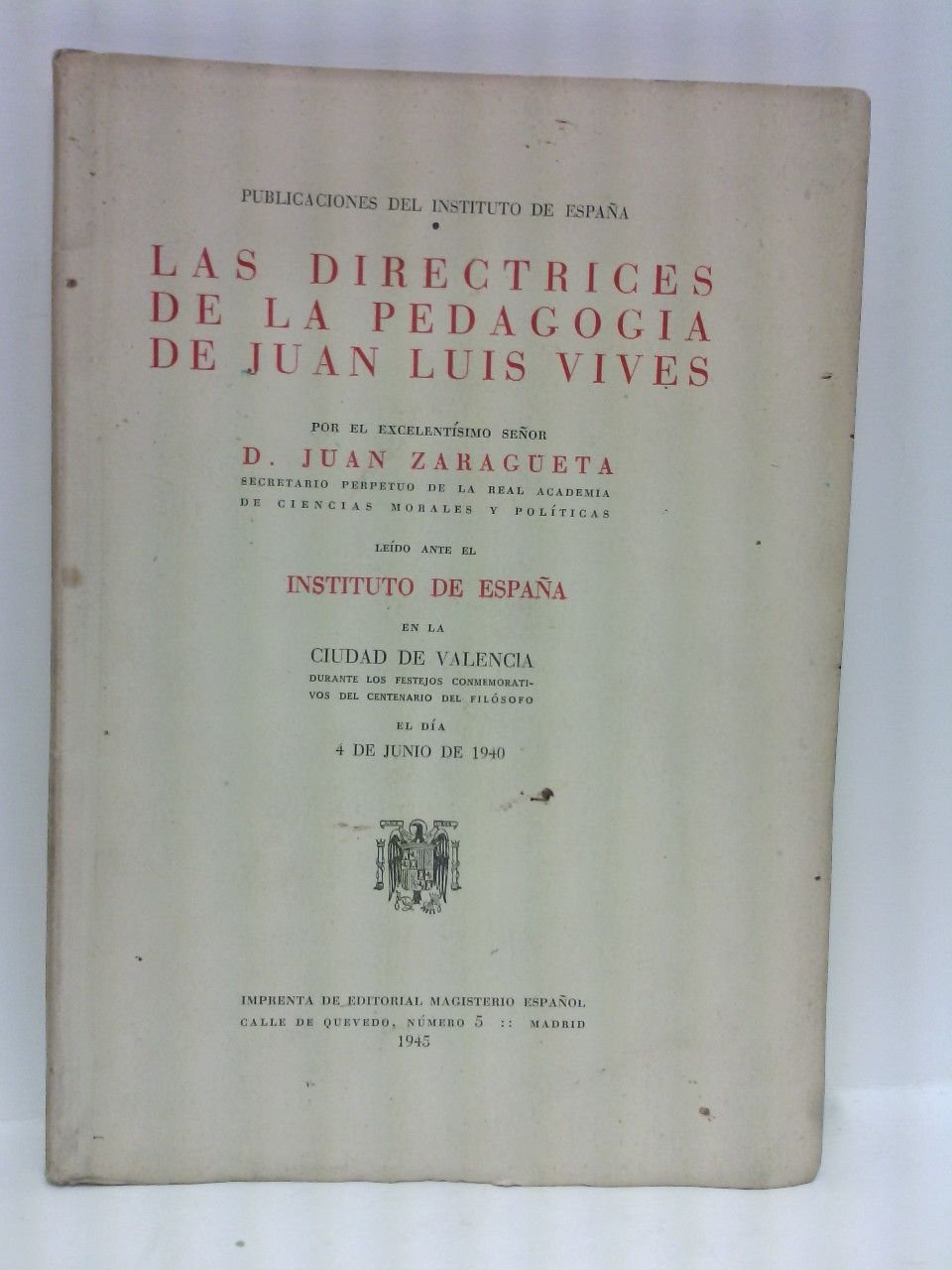 Las directrices de la pedagogía de Juan Luis Vives / [Discurso] leído ante el Instituto de España, en la ciudad de Valencia durante los festejos conmemorativos del centenario del filósofo, el día 4 de junio de 1940 | Libri antichi e moderni | Zaragueta, Juan