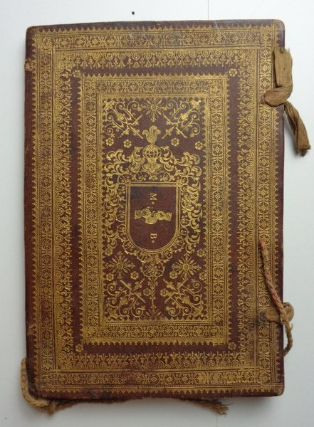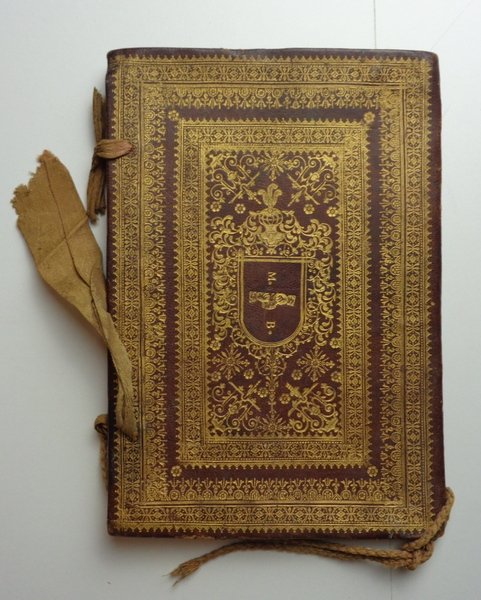 Manoscritto (15x23 cm) di 12 pagine, la prima e l'ultima carta bianca. Testo inquadrato e sottolineato con linee dorate; titolo iniziale In nomine Domini Amen, dotato, così come l'iniziale G ed i nomi dei laureati promossi all'insegnamento, dei loro professori, del promotore (Mutii) e del papa Innocenzo X. Bellissima legatura coeva in pelle rossa completamente decorata da cornici e fregi ai piccoli ferri dorati; scuso centrale con la sigla M.B. e due mani a pugni chiusi. Legacci marroni di chiusura, un cordoncino in coda (di epoca successiva).