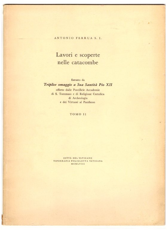 Un opuscolo di 30 pagine (numerate 49-79), brossura editoriale. Dimensioni: 21x28,5 cm. Ottime condizioni. 8 figure e XV tavole in b/n nel testo, 3 tavole a colori fuori testo. Estratto da Triplice omaggio a Sua Santità Pio XII offerto dalle Pontificie Accademie di S. Tommaso e di Religione Cattolica di Archeologia e dei Virtuosi al Pantheon.