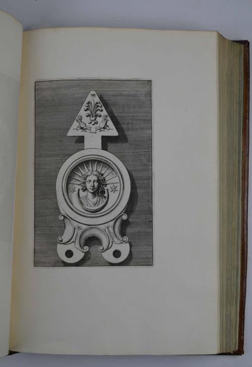 Pp. (6) 16, 16, 12. Con 116 tavole nitidamente incise in rame. Unito a: CIAMPINI G. De abbreviatorum de Parco Maiori sive assistentium R.E. Vicecancellario In Literarum Apostolicarum expeditionibus antiquo stato. Dissertatio storica. Roma, ex Typ. Camerae Apostolicae, 1691. Pp. (6) 123 (13). Con due tavole f.t. incise in rame. Due opere in un volume di cm. 33. Bella legatura coeva in piena pelle interamente decorata a secco, dorso a nervi con titoli su doppio tassello. Esemplare particolarmente fresco, a carte candide ed in perfetto stato di conservazione. Entrambe le opere in edizione originale. Copia da grande collezione.