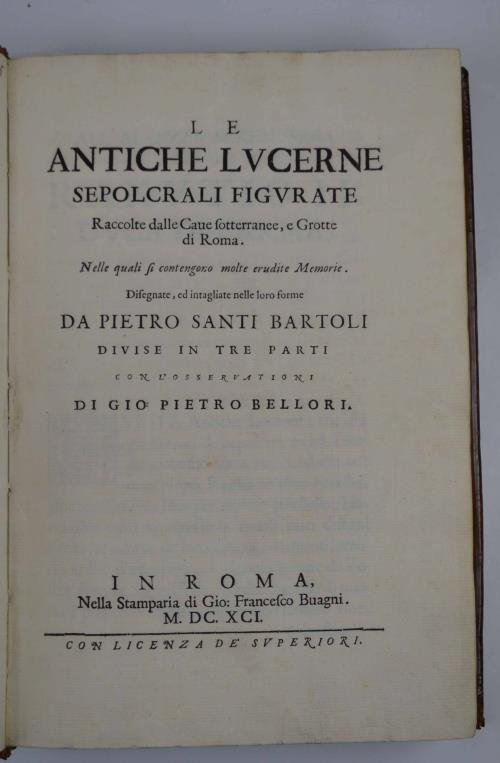Le antiche lucerne sepolcrali figurate raccolte dalle Cave sotterranee, e Grotte di Roma. Nelle quali si contengono molte erudite Memorie. con l'osservazioni di Gio. Pietro Bellori. | Libri antichi e moderni | Santi Bartoli Pietro.