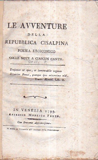 In-12° (190x120mm), pp. 126, brossura gialla coeva. In barbe. Probabile edizione originale (a Milano fu stampata nello stesso anno un'altra edizione dell'opera), rara, di questo anonimo poema eroicomico, dovuto però alla penna di Pietro Bossi, celebrativo delle vicende della Repubblica Cisalpina, dalla nascita del primo Direttorio Cisalpino fino al sopraggiungere degli Austriaci in Milano. Il poema è ripartito in sette canti in ottave; in fine di ogni canto sono poste delle annotazioni esplicative. Il Bossi, su cui scarsissime sono le notizie biografiche, fu autore di numerosi componimenti poetici, tra cui il carme 'Il rustico istruito' e il componimento drammatico 'Il Pertimace'. Melzi, I, p. 103. Cremona / De Longis / Rossi, Una nazione da rigenerare, n. 192.