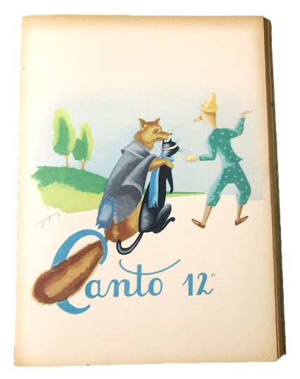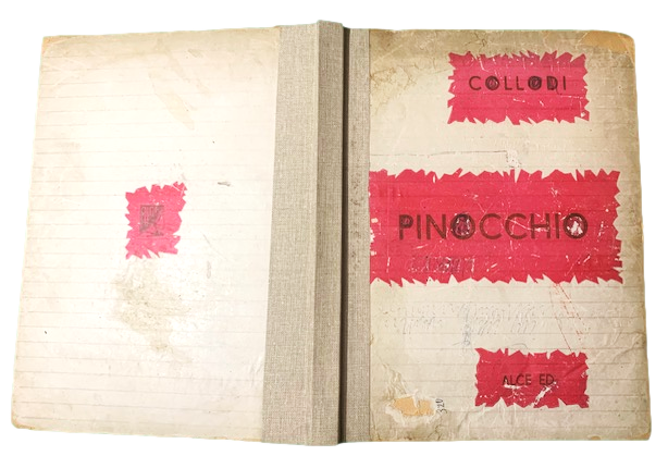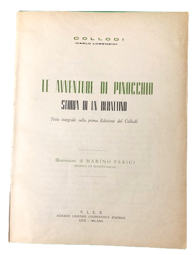 27,5 x 20,5 cm, 200 pp. e 26 c. di tav. fuori testo. Gli esemplari conosciuti presentano 48 tavole fuori testo. Illustrazioni: Marino Parigi (Marino da Montevarchi). Legatura in mezza-tela con applicati ai piatti due brossure, apparentemente editoriali con autore, titolo, casa editrice in nero su fondo rosso al piatto anteriore e al piatto posteriore stemma della A.L.C.E. Entro campo rosso che richiama quella del piatto anteriore. Qualche segno di penne al piatto anteriore in parte cancellati. Magnifiche le cromolitografie a colori di Marino da Montevarchi. Le sue illustrazioni influenzarono in modo decisivo le edizioni susseguenti ed in particolare le produzioni cinematografiche delle avventure del celebre burattino. Segni a penna nel margine esterno bianco di una pagina e a matita su una delle tavole. E' possibile che si tratti di qualche edizione variante (se ne conosce una con una differenza nel frontespizio) perché qua non è mai presente alcun segno delle tavole restanti anche se le tavole, in tutte le copie sono legate, solitamente, con fascette ed incollate, nel margine interno alla pagina seguente. Qui invece non vi sono segni di sorta di asportazione. Questo esemplare, nacque probabilmente così. Non siamo riusciti a rintracciare altri esemplari di Pinocchio edito dalla A. L. C. E. con questo tipo di brossura che però, è, effettivamente, stampata. L'esemplare all'interno si presenta in buone-ottime condizioni di conservazione. Rarissimo.