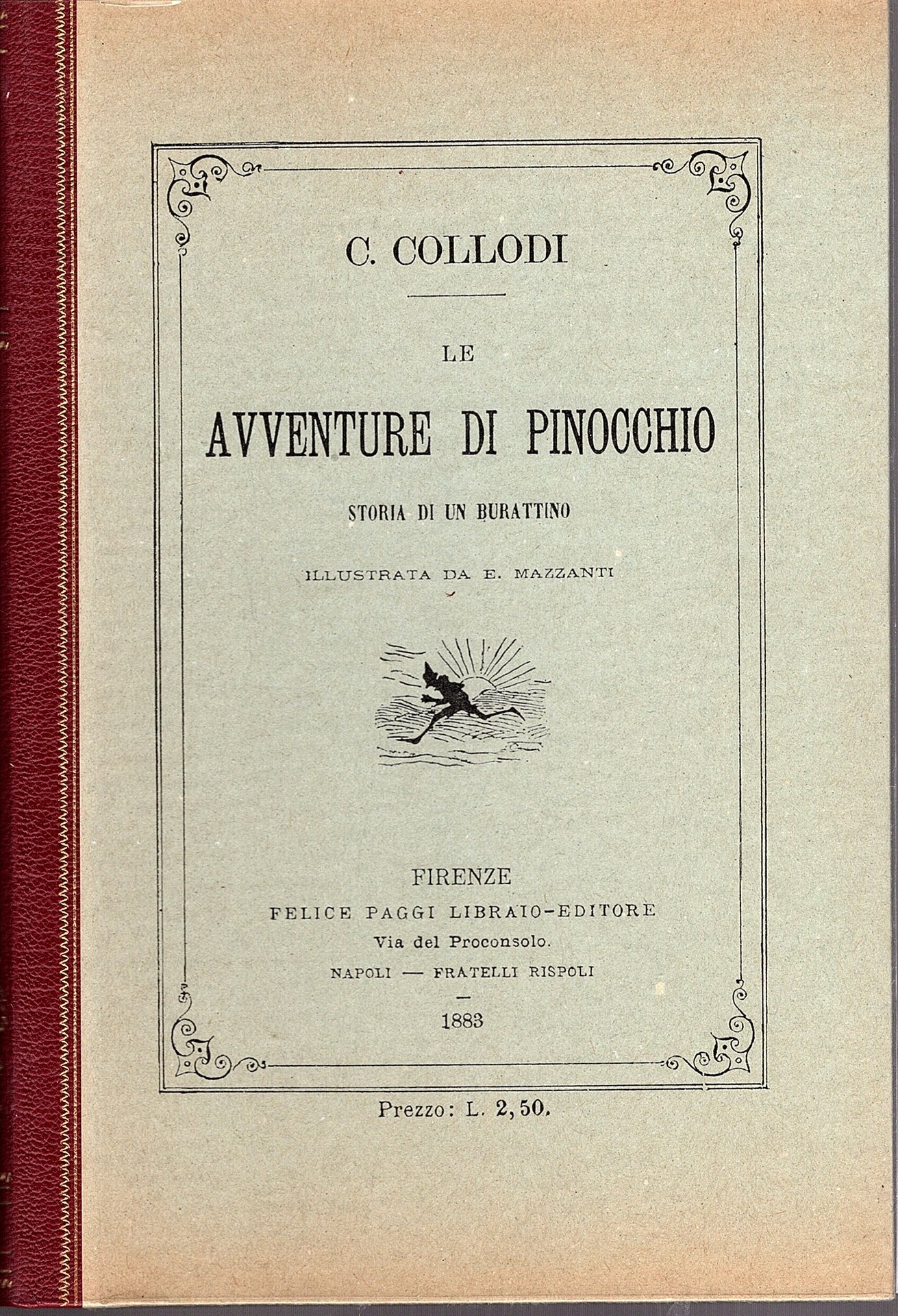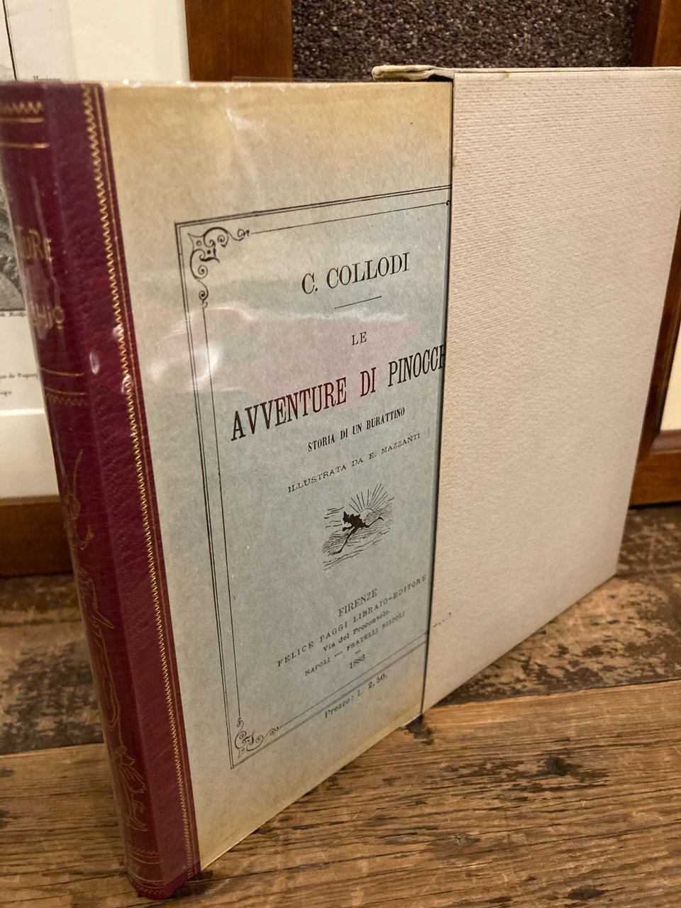 In-8° (20x14 cm), pp. 236, (6). Bella legatura in mezza pelle bordeaux con titolo e fregi al dorso. Taglio superiore dorato, acetato protettivo e custodia editoriale muta. Esemplare stampato in 550 copie. Stato di nuovo. Preziosa ristampa anastatica della storica prima edizione in volume di Le Avventure di Pinocchio, edito a Firenze da Paggi nel 1883 con le illustrazioni di Enrico Mazzanti (Firenze, 1850 - 1910).
