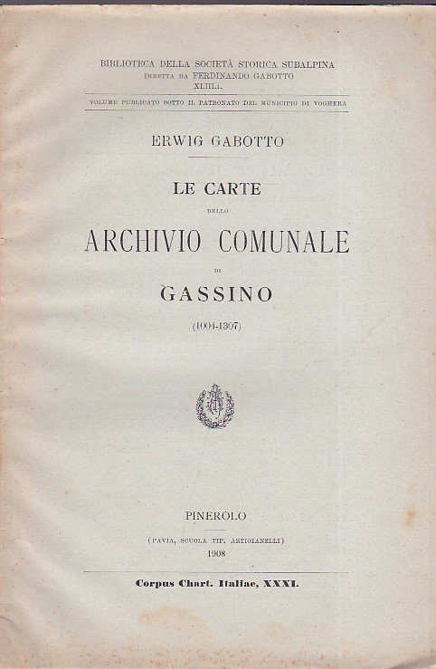 In-8°, pp. 58, brossura editoriale. Perfetto esemplare intonso. Edizione originale, pubblicata sotto il patronato del Municipio di Voghera, volume XXXI del 'Corpus Chartarum Italiae'. Biblioteca della Società Storica Subalpina diretta da Ferdinando Gabotto, XLIII, 1.
