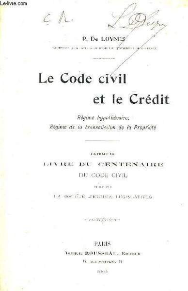 LE CODE CIVIL ET LE CREDIT REGIME HYPOTHECAIRE REGIME DE LA TRANSMISSION DE LA PROPRIETE - EXTRAIT DU LIVRE DU CENTENAIRE DU CODE CIVIL PUBLIE PAS LA SOCIETE D'ETUDES LEGISLATIVES. | Libri antichi e moderni | P. De Loynes