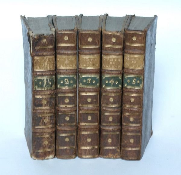 5 Bde. XX, 448 SS. (4), 382 SS. (4), 448 SS. (4), 408 SS. (4), 399, (1) SS. Mit zus. 5 gest. Frontispizen und 7 gest. Tafeln. Lederbände der Zeit mit doppelten goldgepr. Rückenschildchen in braun und grün sowie etwas Rückenvergoldung. 8vo. Zweite Ausgabe (erstmals 1774 im selben Verlag aber in geringerem Umfang erschienen). - Ecken bestoßen; teils leicht fingerfleckig; erster Band mit Defekten an den Kapitalen sowie am oberen Hintergelenk, sonst sehr schönes, attraktiv gebundenes Exemplar. Am vorderen Innendeckel zeitgenöss. hs. Besitzvermerk "Joh. Gf. Hamming". - Vgl. Barbier I, 661-d. Cohen 230. Cohen/Ricci 429. Sander 767.
