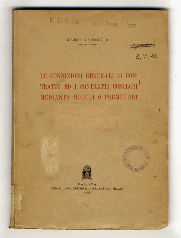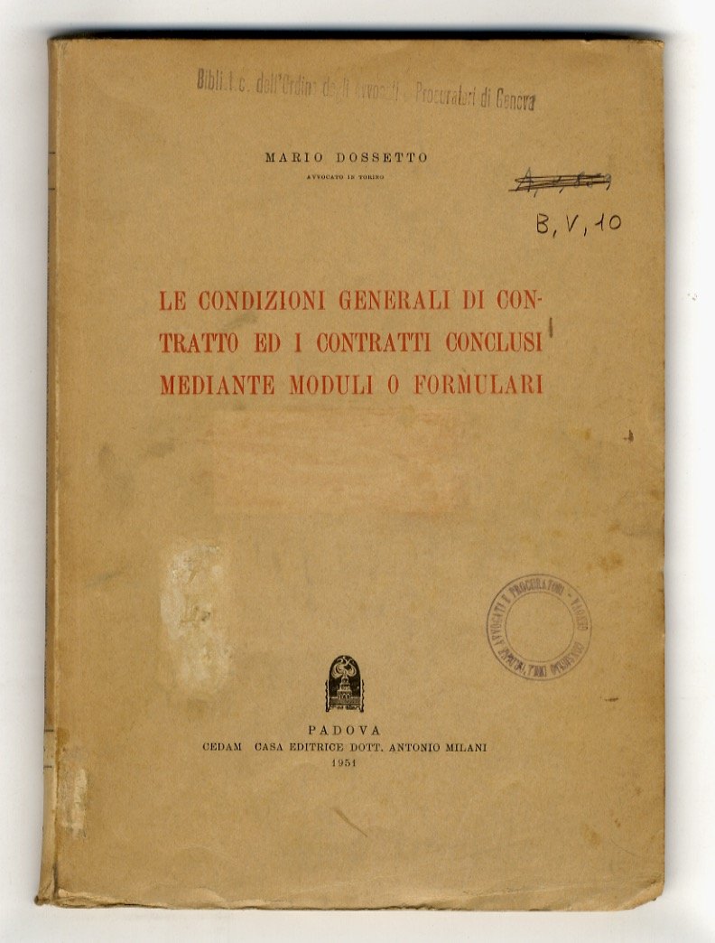Le condizioni generali del contratto ed i contratti conclusi mediante moduli formulari. | Libri antichi e moderni | Dossetto Mario.
