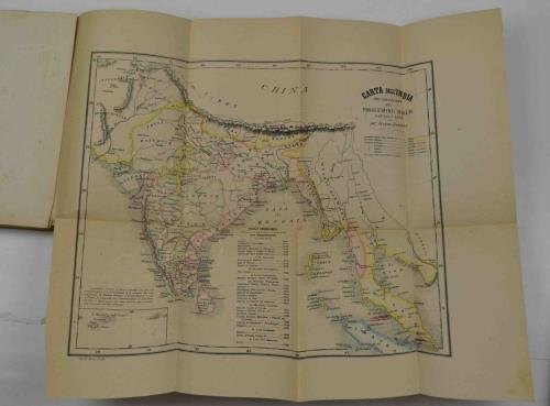 Due volumi di cm. 22,5, pp. (6) 368 (4); (4) 452. Con due grandi carte geografiche ripiegate fuori testo. Brossura originale. Ottimo stato di conservazione. Prima edizione della più articolata opera pubblicata nell'Italia dell'Ottocento in merito alla presenza coloniale inglese in India, dalla primissima colonizzazione sino alle rivolte del 1857-58. La parte di storia coloniale e militare è preceduta da una parte generale con cenni geografici sull'India e cenni sulle razze primitive dell'India, sulle credenze religiose, ecc. Il generale Corte (Vigone, 1826-ivi, 1895) fondò col De Cristoforis cui quest'opera è dedicata) una Scuola di Stato Maggiore volta a preparare gli ufficiali per la Guerra di Crimea e fu decorato nelle battaglie di Staffalo, Peschiera e Novara. "Comandante l'avanguardia del Medici in Sicilia, segnalatosi ad Aspromonte e in Algeria. Deputato, senatore, prefetto di Palermo, divenne, nel forzato riposo, giornalista e storico. Attesi e discussi furono i suoi articoli sul Corriere della Sera" (Sticca).