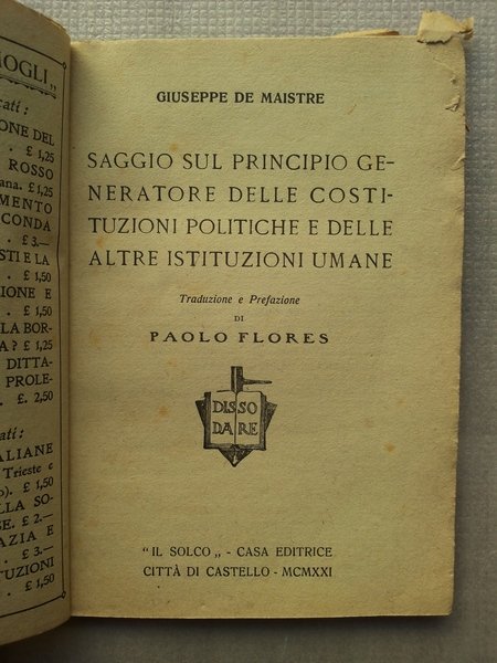 Titolo completo: SAGGIO SUL PRINCIPIO GENERATORE DELLE COSTITUZIONI POLITICHE E DELLE ALTRE COSTITUZIONI UMANE. Traduzione e prefazione di Paolo Flores. Un volume in 12mo di 71 pagine. Brossura editoriale.