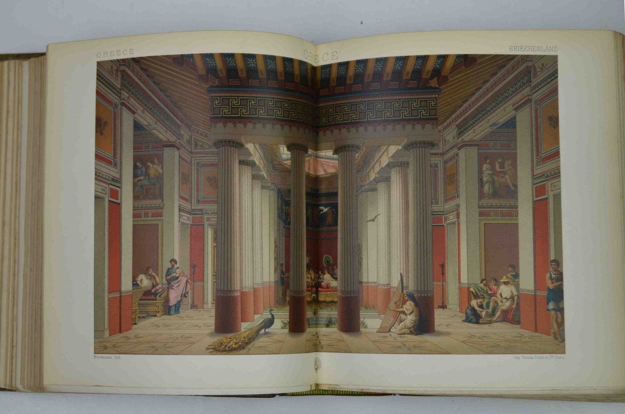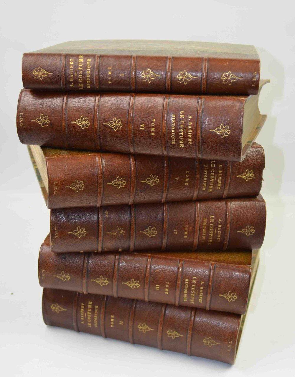 Sei volumi di cm. 21. Il primo volume di testo di pp. xliiii, 288 (48), i seguenti comprendono le 500 tavole (anche a doppia pagina) di cui 300 in cromolitografia e 200 "en camaieu". Ciascuna tavola accompagnata da una o più carte di testo esplicativo. Solida legatura del tempo in mezza pelle a fascia larga, dorsi a nervi con titoli e fregi in oro. Taglio di testa dorato. Qualche lieve e rara fioritura marginale, ma esemplare fresco ed in ottimo stato di conservazione. Eccezionale raccolta iconografica che illustra i principali tipi di abbigliamento e di costumi, spesso rapportati agli interni delle abitazioni, di tutti i tempi e di tutti i popoli. Con numerose tavole di dettagli sul mobilio, le armi, gli oggetti di uso comune, i mezzi di trasporto, i gioielli, ecc. Opera che ha lasciato un segno importante per la storia della tipografia francese dell'Ottocento, soprattutto per il magistrale utilizzo della tecnica cromolitografica. Non comune a reperirsi completa di tutte le tavole. Cfr. Borroni 13507, Vicaire VI, 945-6 e Colas, 2471: "C'est la plus important recueil général concernant le costume...".