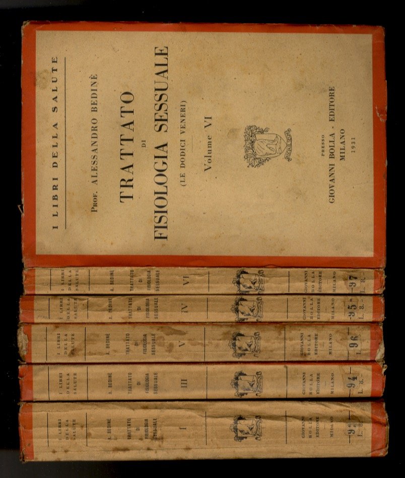 Milano, R. Quintieri (alla sovraccoperta: presso Giovanni Bolla), 1931 (alla sovraccoperta: 1931), volumi 5, in-16, br. editoriale con sovraccoperta, pp. 357, (10); 248, (8); 232, (6); (4), 320, (8); (4), 212, (8). Secondo l'intendimento dell'autore (esplicato in prefazione) è questo un trattato di Fisiologia sessuale "scritto in forma popolare, ma perfettamente scientifico", per venire incontro senza ipocrisia al bisogno di educazione popolare, "distruggendo gli errori e i pregiudizi sessuali". Collezione "I Libri della Salute". Manca il volume II° (contenente le parti IIIa: Venere libera & IVa: Venere malata). Buone condizioni.