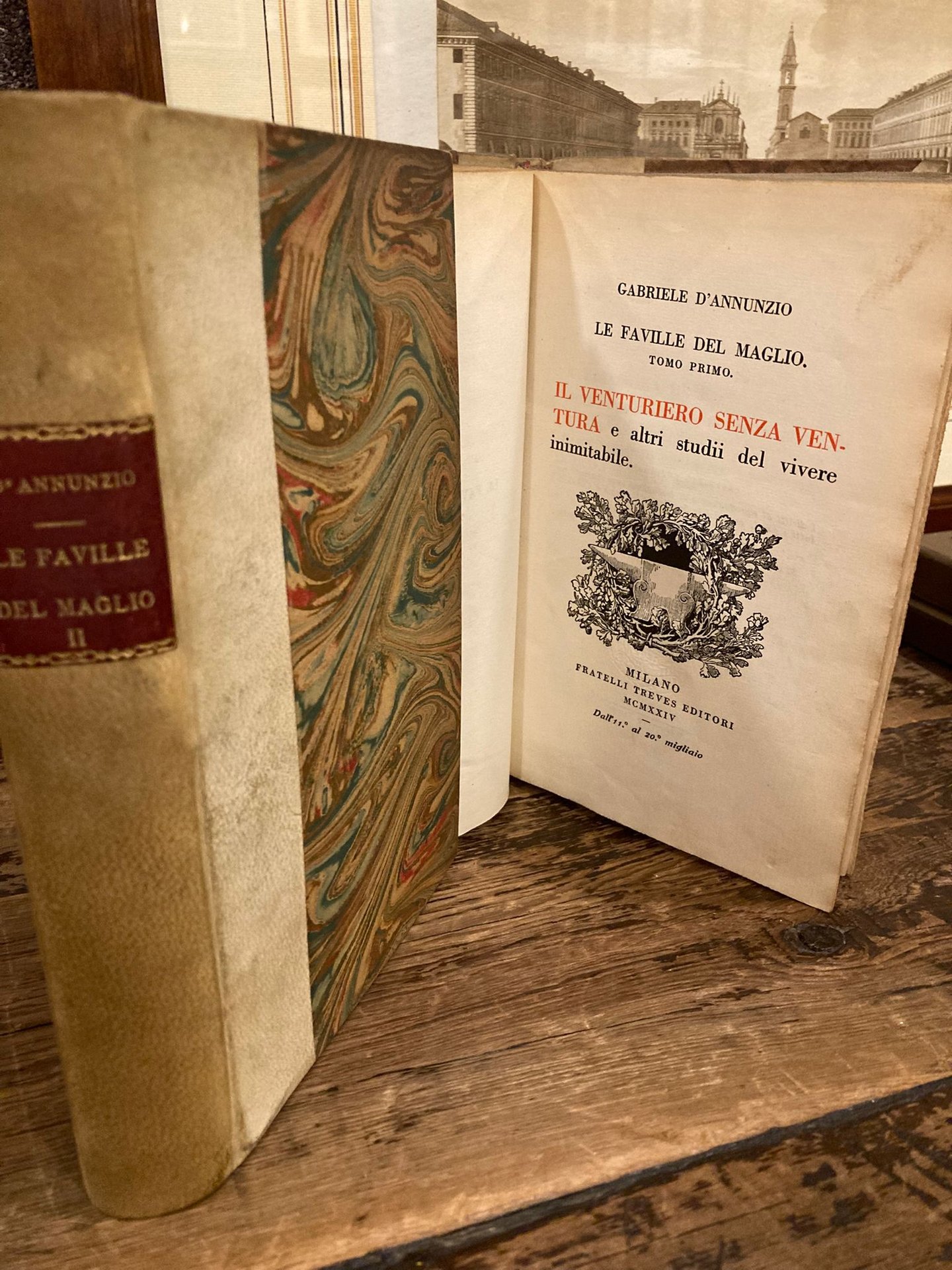 2 voll. in-8°, pp. XX, 653 (3); (8), 386 (2); mezza pergamena coeva con titoli dorati su tasselli ai dorsi, piatti carta marmorizzata,. Frontespizi con titoli in rosso e nero e piccola illustrazione xilografica con un'incudine (il 'maglio' che dà il titolo all'opera, da cui sprizzano le scintille del poeta, il 'Grande Artiere' di carducciana memoria) entro tralci vegetali. Entrambi i volumi sono dedicati ad Eleonora Duse. Ottimi esemplare in barbe, impressi su carta vergata. Edizione originale di entrambi i volumi delle 'Faville del maglio', uno dei culmini della prosa d'arte dannunziana. Il primo volume, edito nel 1924, raccoglie scritti in prosa e in poesia composti per lo più nel decennio 1896-1906, tra i quali particolarmente notevole è 'Il secondo amante di Lucrezia Buti'; il secondo volume presenta prose apparse in precedenza in giornali e riviste, fra cui quella che dà il titolo al libro e 'Di un maestro avverso', rievocazione della simpatia non ricambiata del Vate per Giosue Carducci. Il terzo volume dell'opera, soltanto vagheggiato da D'Annunzio, non fu mai dato alle stampe. Cfr. De Medici, 118 e 123. Guabello, 333 e 345. Vecchioni, 77-78. Falqui, pp. 39-40. Gambetti / Vezzosi, pp. 262-263.