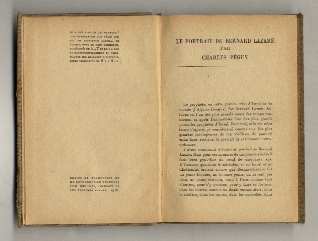 Paris, Les Editions Rieder, 1928 (stampa: octobre), in-16, legatura coeva in piena tela grezza, titolo in oro su tassello in pelle al dorso, pp. 169, [7]. Le pagine da 33 a 48 sono presenti due volte nel volume. Coll. "Judaisme" diretta da Edmond Fleg. Prima edizione, nella tiratura non numerata. Bernard Lazare è stato un critico letterario, giornalista politico, polemista e anarchico ebreo francese. "Le fumier de Job" è l'ultimo suo testo, quello a cui attribuiva maggiore importanza – "la fleur de mon esprit, ma chair et mon sang" – e che rimase incompiuto, allo stato di semplici appunti. Dopo un fallito tentativo di pubblicazione, il fratello minore, nel 1928, ne pubblicò alcuni frammenti (questa edizione). L'opera costituisce una confutazione delle leggende diffuse in ogni epoca sul suo popolo e lo stato finale della sua riflessione sulla questione ebraica; un'illustrazione del nazionalismo ebraico e di un sionismo ostile a Herzl e diverso da quello di Ahad Haam, un sionismo politico che egli voleva, soprattutto, libertario. Una lieve ingiallitura delle pagine.