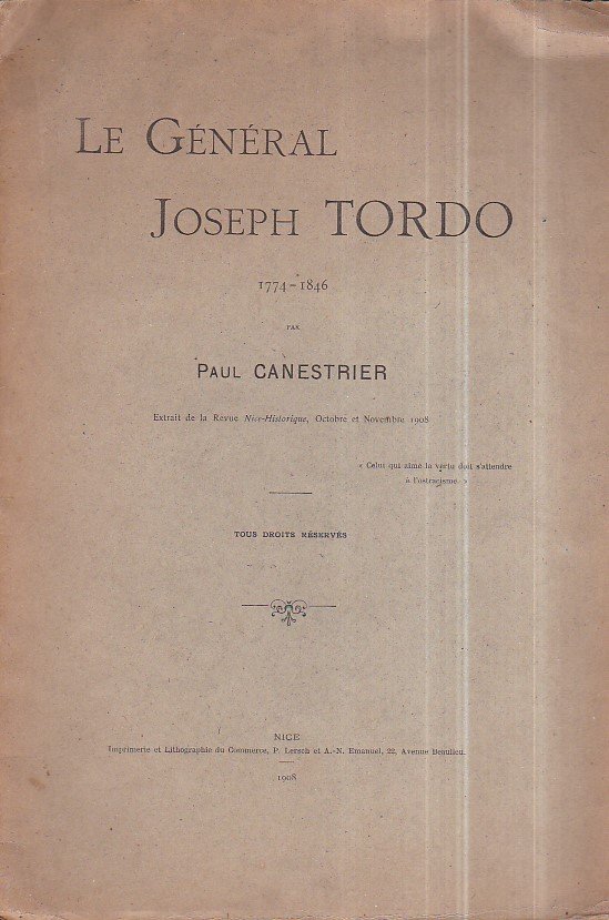 Le Général Joseph Tordo 1774 - 1846. Extrait de la Revue Nice - Historique, Octobre et Novembre 1908 | Libri antichi e moderni | Canestrier Paul