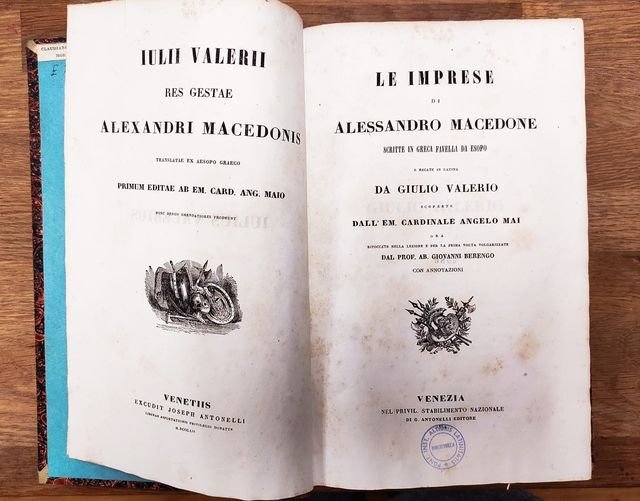 Le Imprese di Alessandro il Macedone. Scritte in greca favella da Esopo e recate in latina da Giulio Valerio. Scoperte dall'Em. Cardinale Angelo Mai, ora ritoccate nella lezione e per la prima volta volgarizzate dal Prof. Ab. Giovanni Berengo con annotazioni | Libri antichi e moderni | Giulio Valerio, Esopo, ,Giulio Valerio, Esopo