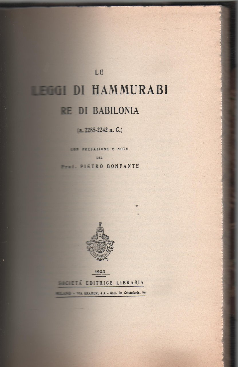 Le leggi di Hammurabi re di Babilonia (a. 2285-2242 a.C.). Con prefazione e note del Prof. Pietro Bonfante | Libri antichi e moderni | BONFANTE P.