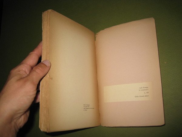 In-16° (19.5x13 cm), pp.189, (3), brossura editoriale rosa antico, titoli a due colori al dorso e al piatto anteriore. I Gettoni, 2. Segni del tempo e d'uso alla brossura (minimi difetti alle cuffie, macchioline al piatto anteriore). Ex libris sotto forma di timbro al frontespizio, pagine con lievi bruniture marginali. Più che discreto esemplare protetto da velina. Non comune prima edizione. Si tratta del secondo libro della Romano ma il primo di narrativa. Spaducci, p. 249. Gambetti-Vezzosi, p. 779: 'Non comune e abbastanza ricercato'.