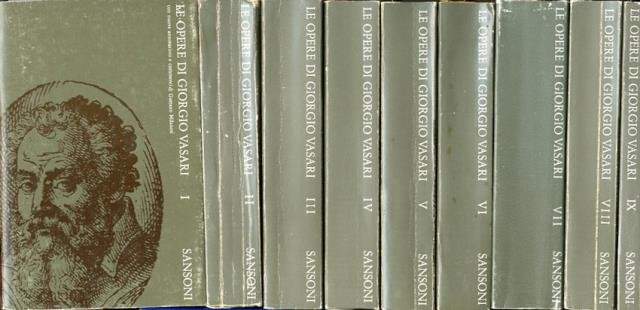 Reprint dell'ed. del 1906. 9 v. (V. 1, VIII, 698; v. 2 p. 692; v. 3 p. 714; v. 4 p. 654; v. 5 p. 660; v. 6 p. 662; v. 7 p. 728; v. 8 p. 629; v. 9 p. 267.) : ill. ; 21 x 14 cm. "Le vite de' più eccellenti pittori, scultori, e architettori" è una serie di biografie di artisti, scritta nel 16. secolo dal pittore e architetto aretino Giorgio Vasari (1511-1574). Spesso l'opera viene chiamata semplicemente "Le Vite". Il trattato del Vasari venne edito nel 1550 da Torrentini ed ebbe uno straordinario successo che spinse l'autore a curare una seconda edizione ampiamente rivista e rinnovata, pubblicata dalla famiglia Giunti nel 1568. È il primo libro organico di storia dell'arte che ci sia pervenuto, nonché la fonte, spesso unica, di notizie biografiche degli artisti a cavallo tra Medioevo e Rinascimento, nonché di informazioni su opere d'arte poi disperse, perdute o distrutte. Appassionato e meticoloso, Vasari cadde talvolta di eccessiva enfasi letteraria nel tracciare gli sviluppi dell'arte e i rapporti tra gli artisti. Gli studi successivi sul testo vasariano (tra cui quello scrupoloso di Gaetano Milanesi del 1848) hanno tuttavia circoscritto gli errori e le notizie rivelatesi fasulle (dovute spesso a quella creduloneria che ingannò molti storici del passato), restituendo il pieno valore del testo, che non solo influenzò il giudizio in materia d'arte fino a buona parte del 19. secolo, ma è tutt'oggi un'imprescindibile e citatissima referenza bibliografica. Brossura editoriale, coperta illustrata (b/n) in cartoncino flessibile colorato (verde) plastificato opaco con alette. Qualche segno del tempo alle coperte dei volumi, qualche sottolineatura a matita in alcuni tomi ma nel complesso opere in buono stato. Codice libreria 3567.