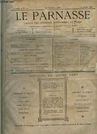 15 janvier 1881. In-12. Broché. Bon état, Livré sans Couverture, Dos satisfaisant, Intérieur frais. 16 pages. Pages abimées, renforts adhésifs. . . . Classification Dewey : 840-Littératures des langues romanes. Littérature française