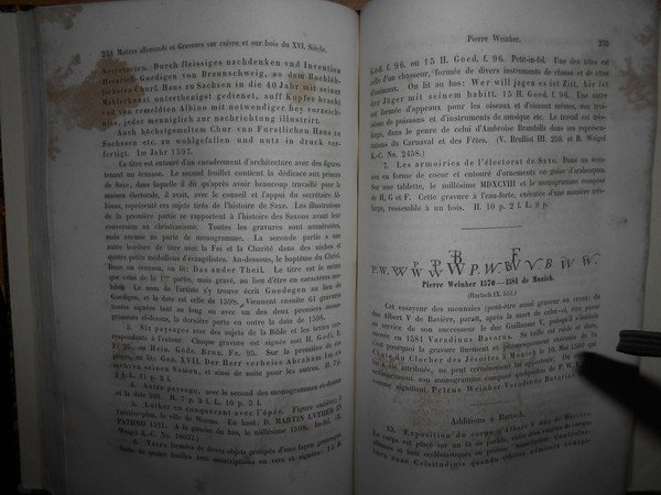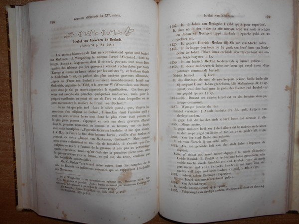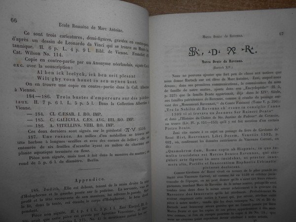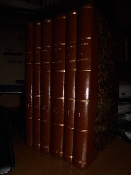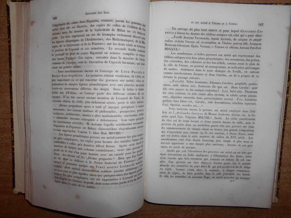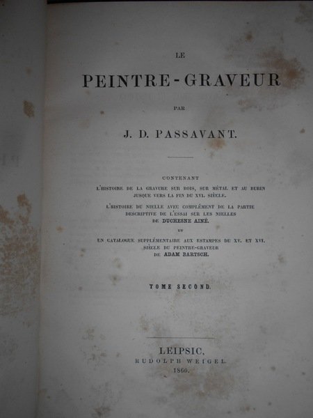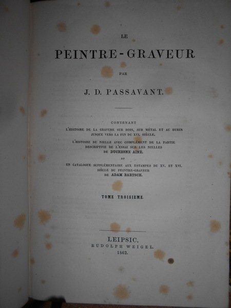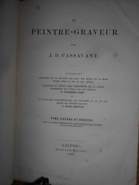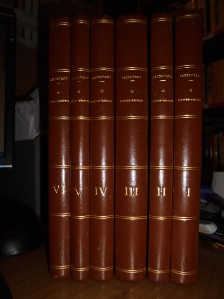 par J.D. PASSAVANT. Leipsic, 1860/1864. Le PEINTRE-GRAVEUR. Edizione originale. 6 volumi in-8°, m. pelle con titoli e fregi in oro ai dorsi. Ritratto dell'Autore inciso da L. Sichling su disegno di Julius H. all'antiporta del primo tomo. I. xvi, 377, (1) pp.; II. 303, (1) pp.; III. 504, (7) pp.; IV. 351 pp.; V. vi, 238 pp.; VI. 407 pp. Opera completa in edizione originale con bella legatura ma con vistose bruniture dovute alla qualità della carta. Uff. E - V - 4