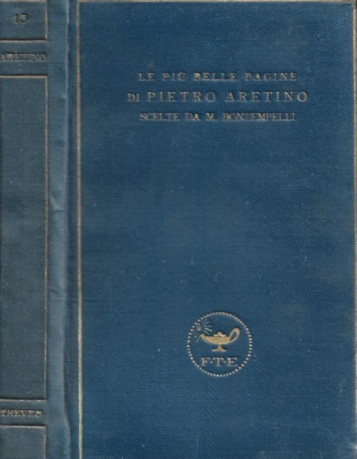 Opere di Pietro Aretino scelte da Massimo Bontempelli, volumetto pocket n. 15 della collezione diretta da Ugo Ojetti, copertina rilegata in pelle con incisioni in oro al piatto anteriore e al dorso, punte e cuffie visibilmente consunte, abbastanza buono lo stato. Pagine generalmente ben conservate, nessuna mancante o danneggiata, tonalità uniformemente ossidate, muffe ai tagli scuriti dalla luce. N. pag. 301.