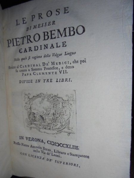 Bembo, Pietro. In Verona, presso Antonio Berno, Libraro e Stampatore, 1743. Le Prose di Messer PIETRO BEMBO Cardinale nelle quali si ragiona della volgar lingua. Scritte al Cardinal De' Medici, che poi fu creato a Sommo Pontefice, e detto Papa Clemente VII. Divise in tre libri. In-8°, pergamena rigida coeva con titolo in oro sul dorso, (mm. 200x140). 8, 279, (1) pp. Bella edizione veronese su carta fine. Copia immacolata, con barbe. Neg. mass. mob. P