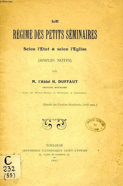 LE REGIME DES PETITS SEMINAIRES SELON L'ETAT & SELON L'EGLISE (SIMPLES NOTES) | Libri antichi e moderni | Duffaut Abbe H.