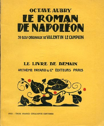 In-8°, pp. 142, brossura editoriale gialla con titolo in nero e illustrazione xilografica in rosso e in nero. Antiporta xilografica e 39 xilografie n.t. di Valentin Le Campion realizzate appositamente per il volume. Perfetto stato. In parte intonso. Romanzo ispirato alla figura napoleonica del grande storico francese Octave Aubry (Parigi, 1881-ivi, 1946). Allievo di Albert Sorel, di Albert Vandal e di Anatole Leroy-Beaulieu, compose anche romanzi a soggetto storico. Eletto all'Académie Française nel febbraio 1946, si spense il mese seguente alla vigilia del suo discorso di accoglimento in essa. Le sue opere sono ispirate in prevalenza al periodo napoleonico e al Secondo Impero.