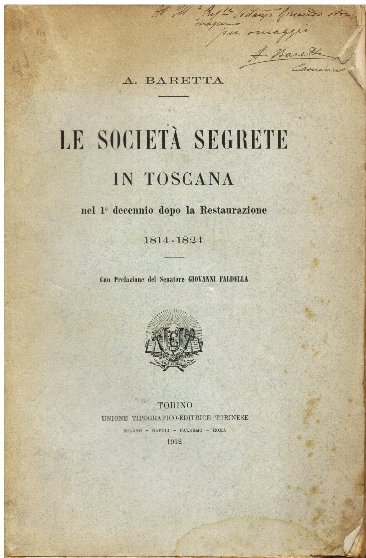 In-8°, pp. VIII, 175, brossura editoriale. Bell'esemplare in barbe. Fioriture normali. Dedica autografa dell'autrice allo storico Costanzo Rinaudo. Il Rinaudo, nato nel 1848 a Busca, presso Cuneo, morto a Torino nel 1922, allievo in gioventù di Ercole Ricotti, fu professore di storia a Torino, sia nei licei che all'università, e si occupò anche, in un'estesa bibliografia, di filosofia, teologia e diritto. Prima edizione, non comune, di fondamentale studio sulla Massoneria e le società segrete in Toscana nel decennio 1814-1824. Con prefazione di Giovanni Faldella e ampia appendice di documenti, spesso pubblicati per la prima volta. Lattanzi, n. 173.