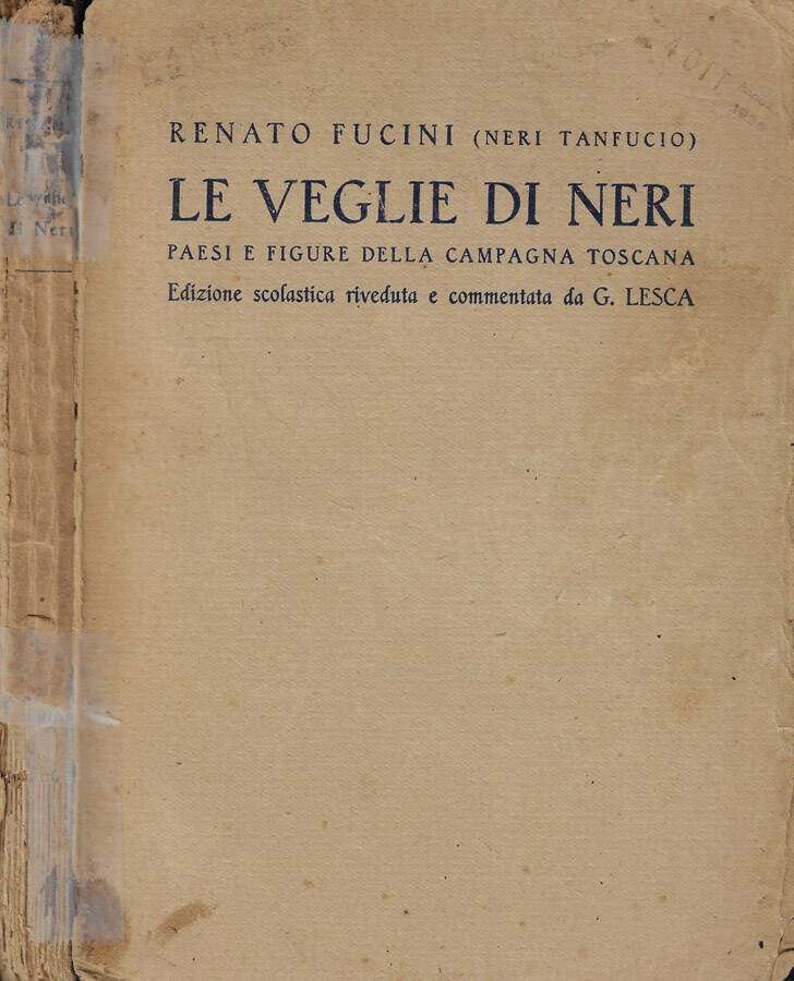 Edizione scolastica riveduta e commentata da G.Lesca. Brossura in cartoncino, brunita e segnata dal tempo, con scotch trasparente al dorso e piccola mancanza al suo piede e con margini sfilacciati. Pagine ingiallite, con tagli irregolari, note al piede e lieve alone causa umidità al margine superiore. Ad inizio volume tavole con ritratto di Fucini dipinto da A. Ciseri nel 1877. Numero pagine 205.