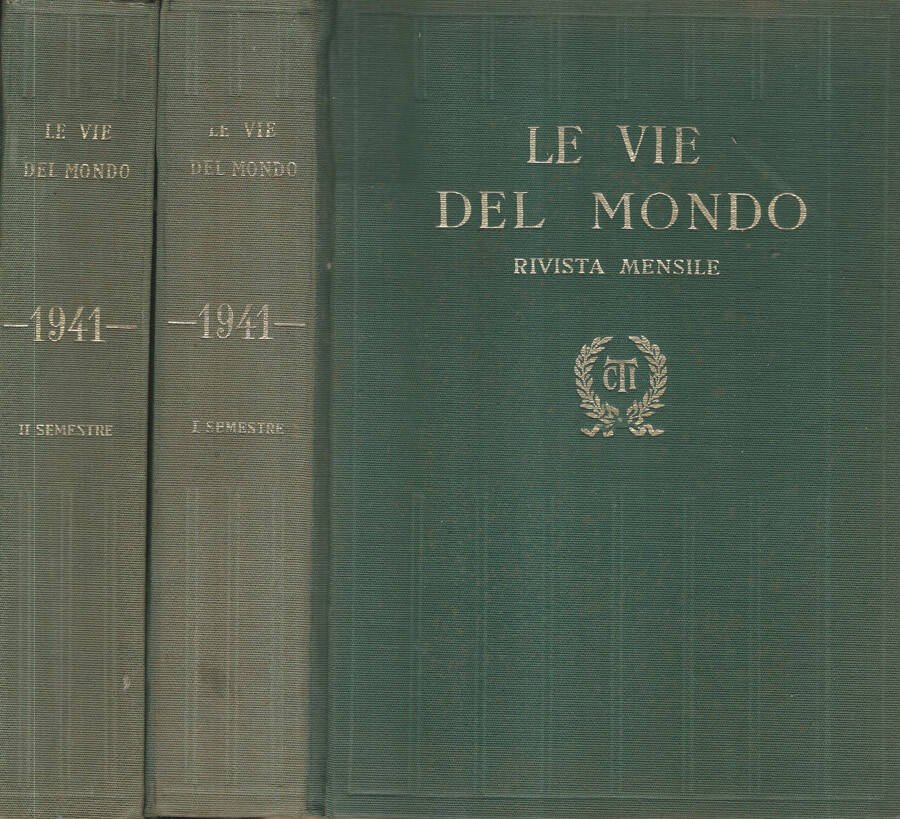 Le vie del Mondo, Anno IX, 1941, Cofanetto I ° Semestre, comprendente dalla rivista n° 1 alla rivista n° 6 dell'anno IX e Cofanetto 2° Semestre, comprendente dalla rivista n° 7 alla rivista n° 12 dell'anno IX. Raccolta della Rivista Le vie del Mondo contenuta in due cofanetti in tela in buona conservazione, caratteri in oro ben leggibili. Riviste all'interno in discreta conservazione, il dorso irregolare, le copertine a colori piuttosto ben conservate, le pagine integre, la legatura salda. Numero pagine nd.