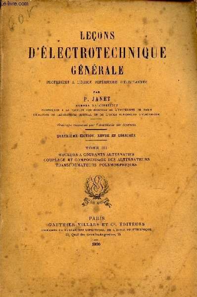 LECONS D'ELECTROTECHNIQUE GENERALE - TOME III : moteurs � courants alternatifs, couplage et compoundage des alternateurs, transformateurs polymorphiques / 4eme EDITION REVUE ET AUGMENTEE. | Libri antichi e moderni | Janet P.