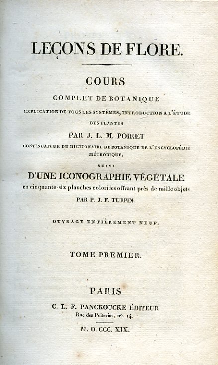 Leçons de Flore. Cours complet de botanique. Explication de tous les systèmes, introduction a l'études des plantes. Suivi d'une Iconographie Végétale en cinquante - six planches coloriées offrant près de mille objets. Ouvrage entièrement neuf | Libri antichi e moderni | Poiret Jean Louis Marie - Turpin Pierre Joseph François