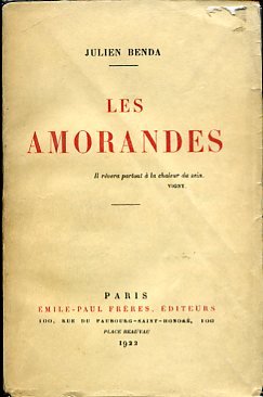 In-16° (193x121mm), pp. 283, brossura editoriale. Dedica autografa dell'autore: 'à Gonzague Truc bien sympathique hommage Julien Benda'. In barbe, con ingialliture dovute al tipo di carta. Buon esemplare. Ex-libris Claude Calisti. Edizione originale (tiratura non numerata). Il dedicatario dell'esemplare, Gonzague Truc (Flayosc, 1877-Parigi,1972) fu illustre critico letterario e saggista, per un certo tempo fiancheggiatore dell'Action française di Maurras. Per una breve sintesi sull'importanza di Benda nella storia della cultura, P.M.M., m. 419.