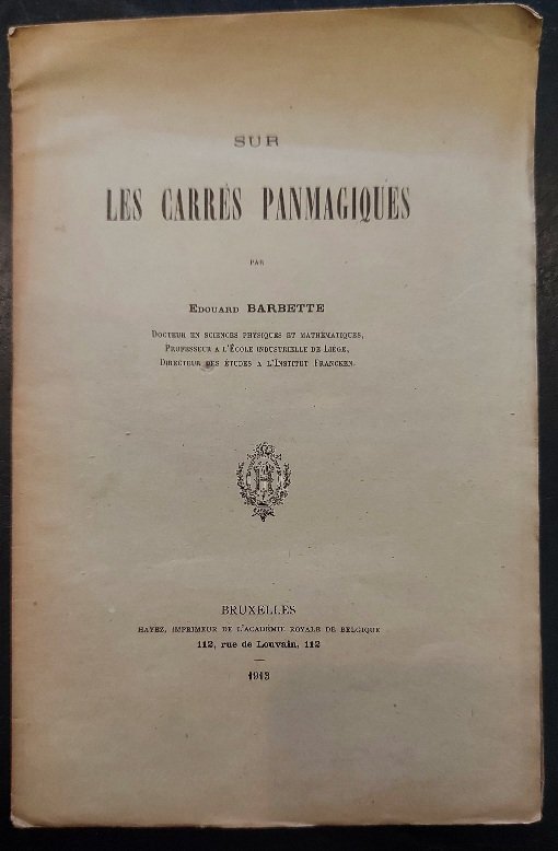 In 8, cm 16,5 x 25, pp. 32. Brossura editoriale. Estratto editoriale da: Memoires de la societe royale des sciences de Liege. T. X, 1913. Edizione originale di questo trattatello sulla definizione dei quadrati panmagici, definiti anche da Lucas come diabolici