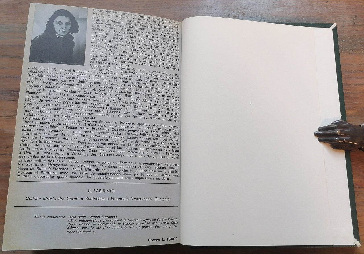 (Giardini - Rinascimento - Colonna Francesco - Hypnerotomachia Poliphili) In 8°, legatura in mezza tela nera, al dorso tassello in pelle verde con titoli e filetti in oro, conservate le copertine della brossura originale, pp. 451,(1), con figure in nero nel testo. Prefazione di Pierre Lyautey. Collana "Il Labirinto" coordinata da Carmine Benincasa e Emanuela Kretzulesco Quaranta. Ottimo stato di conservazione.