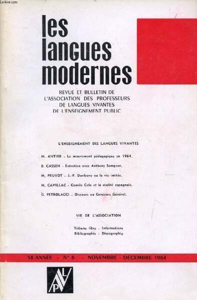 LES LANGUES MODERNES, 58e ANNEE, N� 6, NOV.-DEC. 1964 (Sommaire: L'ENSEIGNEMENT DES LANGUES VIVANTES. M. ANTIER - Le mouvement p�dagogique en 1964. B. CASSEN - Entretien avec Anthony Sampson. M. PRUVOT - J.-P. Donleavy ou la vie imit�e. M. CAVILLAC.) | Libri antichi e moderni | Collectif