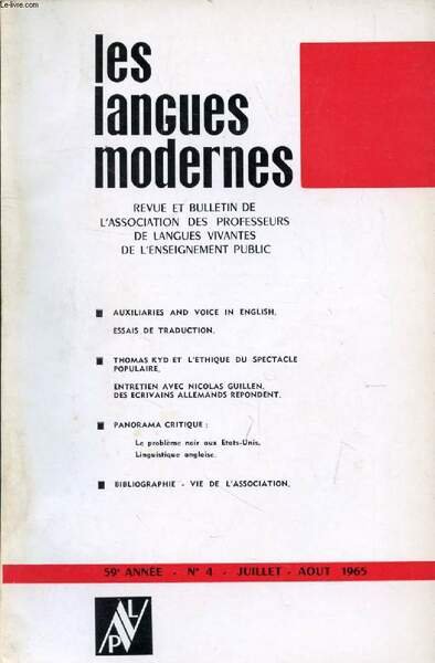 LES LANGUES MODERNES, 59e ANNEE, N� 4, JUILLET-AOUT 1965 (Sommaire: AUXILIARIES AND VOICE IN ENGLISH. ESSAIS DE TRADUCTION. THOMAS KYD ET L'ETHIQUE DU SPECTACLE POPULAIRE. ENTRETIEN AVEC NICOLAS GUILLEN. DES ECRIVAINS ALLEMANDS REPONDENT.)